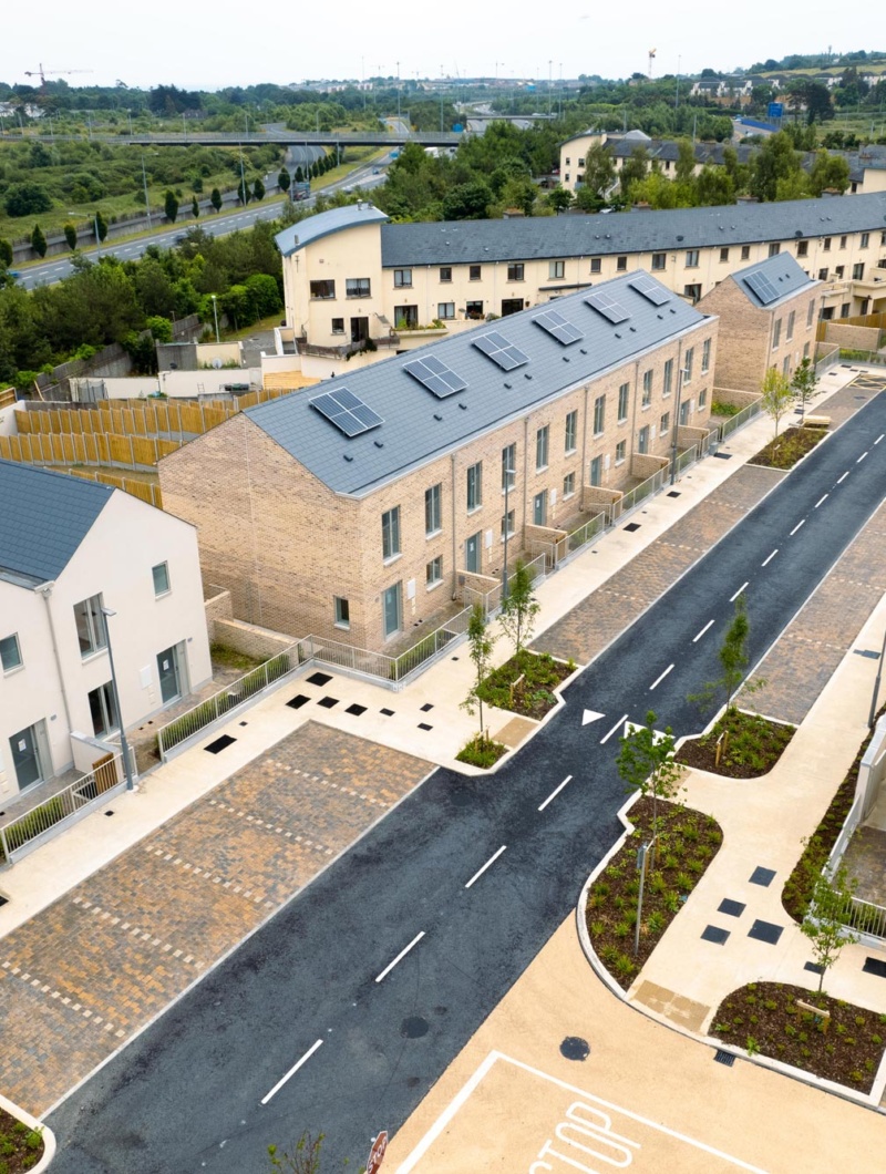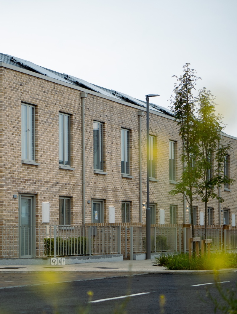 Phase 1 of this client-side Design and Build project for Dun Laoghaire-Rathdown delivered 67 No. homes. There are an additional 52 No. apartments planned for delivery in Phase 2 of this Ballyogan scheme. This project involved preparing a full set of tender documents with the only variable for the design and build contractor being the structure. High spec finishes such as hidden gutter detailing with powder coated aluminium hopper heads and downpipes, alu-clad windows with powder coated pressed aluminium cills and railing detail including powder coated finish and feature granite base served to elevate the quality of this rapid delivery scheme.